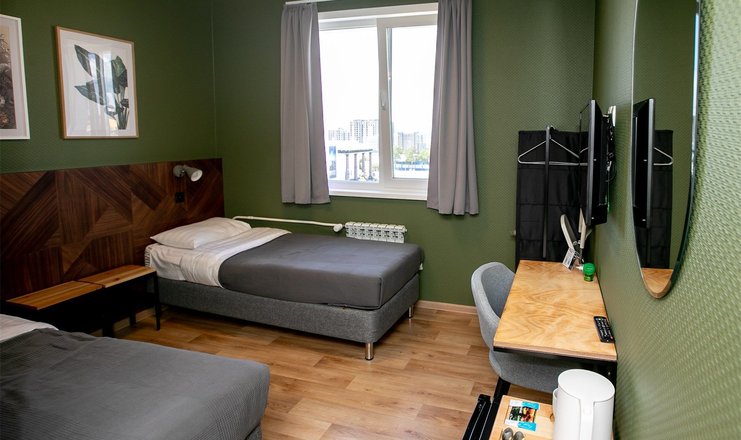В номере: вешалка, зеркало, кровати односпальные, прикроватные тумбочки, стол, стулья, шкаф, кондиционер, мини-холодильник, телевизор, чайная станция